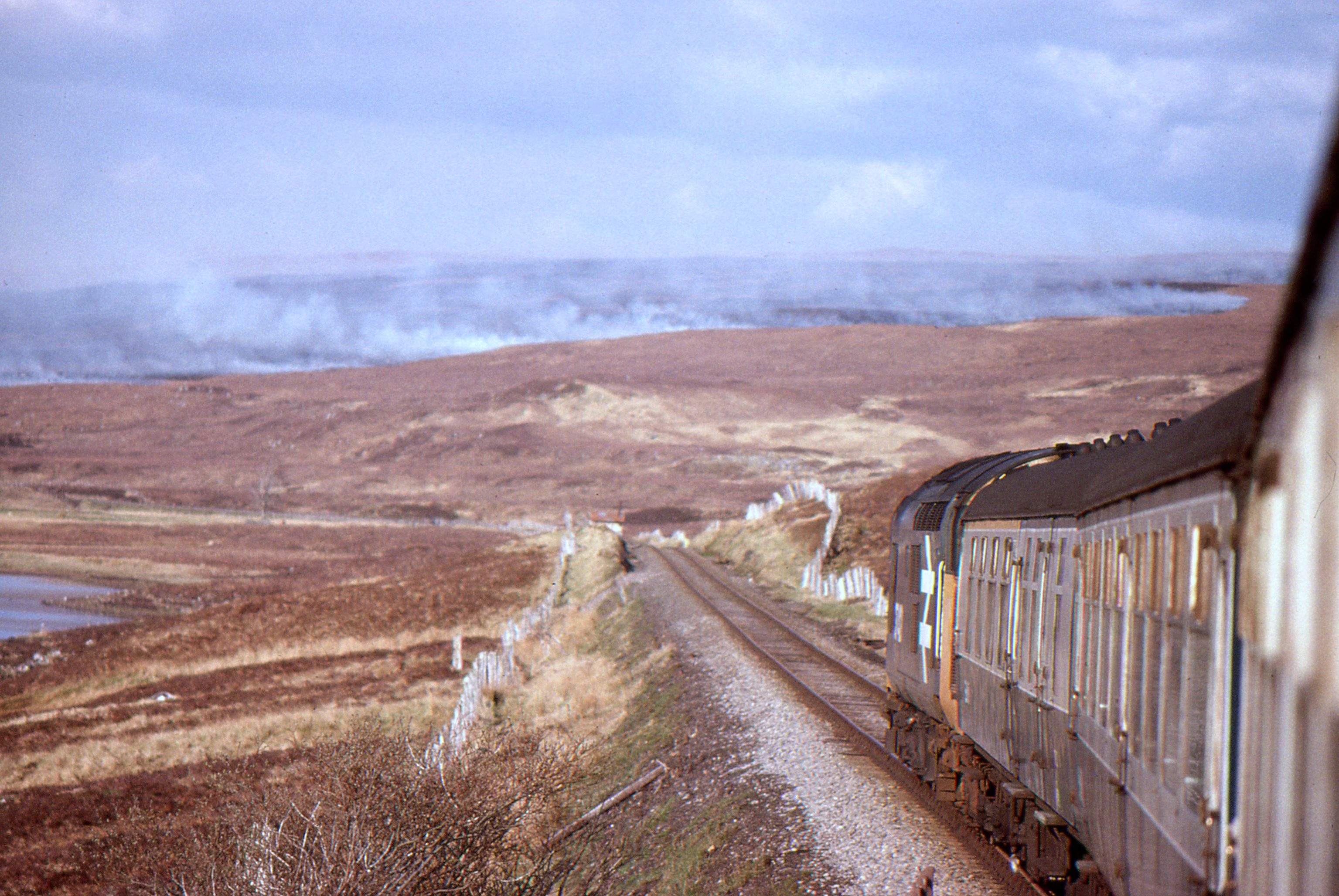 Today's historic photo of the day: A British Rail train from Kyle of Lochalsh bound for Inverness, hauled by diesel locomotive 37421, with what appears to be a peat fire on the hills near Achnasheen, Scotland, UK, April 28 1988.